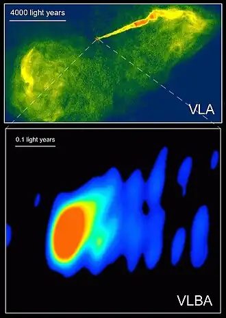 Радиоинтерферометр — инструмент для радиоастрономических наблюдений с высоким угловым разрешением, который состоит, как минимум, из двух антенн, разнесённых на расстоянии и связанных между собой кабельной линией связи[10][11]. Радиоинтерферометры используются для измерения тонких угловых деталей в радиоизлучении неба[12]. В частности, с их помощью получают особо точные координаты и угловые размеры астрономических объектов, а также радиоизображения небесных тел с высоким разрешением[13].