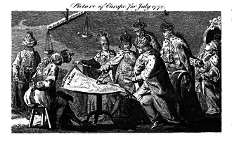 - ↑ Первый раздел Польши (1772) на английской карикатуре того времени, Екатерина II (Россия), Фридрих II (Пруссия) и Иосиф II (Австрия) делят Польшу при тихом согласии закованного в кандалы султана Мустафы ІІІ. Польский кололь Станислав Август Понятовский взирает на происходящее со связанными за спиной руками. Британский король Георг III, восседающий на Британском троне (справа), упал в обморок; символические весы "баланса сил" показывают малый политический вес Великобритании.