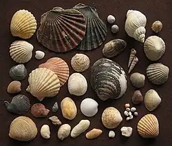 - Моллюски. Раковины моллюсков известковые на органической основе[12]. Они могут быть цельными, либо состоять из двух отдельных створок — правой и левой (у двустворчатых моллюсков)[13] или из восьми или семи пластинок (у панцирных моллюсков)[13]. У головоногих моллюсков раковина может быть многокамерной[5].