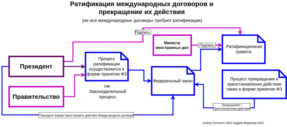 Инициаторами внесения договора на ратификацию могут являться Президент и Правительство. Ратификация международного договора осуществляется Государственной думой в форме принятия федерального закона, также как и процесс прекращения или приостановления его действия. Президент вправе приостановить действие международного договора в исключительных случаях с информированием Совета Федерации и Государственной думы, и последующим внесением соответствующего проекта федерального закона. В случае отклонения Государственной думой проекта федерального закона, международный договор продолжает своё действие[7].
