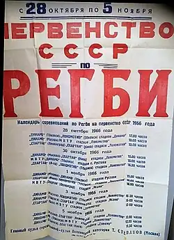В 1966 году состоялся первый неофициальный чемпионат СССР по регби среди клубов[4][33]. В 1968 году чемпионат стал проходить на постоянной основе[17] после воссоздания Федерации регби СССР[4][33], а команды появились даже в солнечных Таджикистане и Узбекистане[28]. Федерацию регби СССР возглавлял с 1967 по 1991 годы Герой Советского Союза, лётчик-испытатель и генерал-майор авиации В.С.Ильюшин. В 1960-е появилась первая школа тренеров по регби, где читались лекции по подготовке игроков к матчам и сезонам[28]. Студенты МГТУ имени Баумана сыграли важную роль в развитии игры[28]. Союзные федерации были образованы в Литве (1961)[35], Латвии (1963)[5], Грузии (1964)[36] и России (1966)[32]. Позже сборная СССР провела первый в истории матч (неофициальный) против команды Польши в 1960 году[28], чтобы набраться первого международного опыта[37].