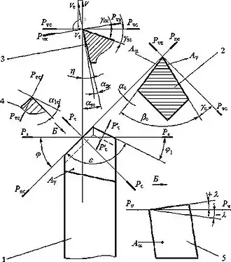 - Вспомогательная секущая плоскость — плоскость, перпендикулярная проекции вспомогательной режущей кромки на основную плоскость.