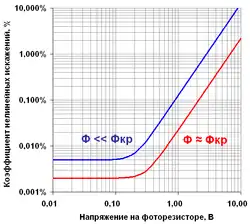 Нелинейные искажения, порождаемые фоторезистором, зависят от приложенного к нему напряжения и от освещённости. По данным PerkinElmer, КНИ для данного напряжения минимален при большой освещённости и малом сопротивлении фоторезистора. С уменьшением освещённости и ростом сопротивления КНИ увеличивается в несколько раз. Относительная разница между минимальным и максимальным значением КНИ для каждого типа фоторезистора практически не зависит от приложенного напряжения[61].