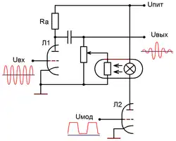 В первом усилителе Fender c эффектом тремоло[note 3], выпущенном в 1955 году[81], генератор тремоло управлял напряжением смещения предвыходного каскада. Сигнал генератора неизбежно проходил на выход усилителя, порождая заметные призвуки[82]. В начале 1960-х годов Fender и Gibson применили в качестве модулятора тремоло оптопару, фоторезистор которой подключался через блокирующий конденсатор и регулирующий потенциометр между выходом предусилителя и общим проводом. При протекании тока через лампу фоторезистор шунтировал выход предусилителя на землю, и уровень выходного сигнала падал. В этой схеме прохождение управляющего сигнала на выход было исключено[82]. Глубина модуляции регулировалась относительно низкоомным[note 10] потенциометром, вынесенным на лицевую панель. Независимо от положения потенциометра, модулятор существенно снижал коэффициент усиления предшествующего каскада, поэтому предусилитель должен был иметь запас по усилению, а физический разрыв цепи модулятора менял не только уровень, но и тембр усилителя[26].