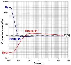 - RФ — идеальный фоторезистор, сопротивление которого обратно пропорционально освещённости. Так как RТ на несколько порядков больше, чем RОСТ, то в большей части рабочего диапазона освещённостей Ф полное сопротивление определяется именно RФ:[45] R (Ф) ≈ RФ. Динамический диапазон фоторезистора по освещённости приравнивается к отношению критической освещённости ФКР к порогу чувствительности ФП, при этом ГОСТ определяет ФКР как освещённость, при которой ток через фоторезистор отклоняется от идеального линейного закона зависимости (I (Ф) = kФ) более, чем на 20 %[46] (то есть при увеличении фактического сопротивления до более чем 120% от идеализированного RФ).