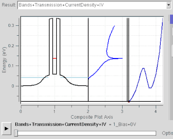 Основная часть электронов в эмиттирующем контакте расположена энергетически близко к краю зоны проводимости в этой области. При нулевом напряжении этот край обычно лежит ниже, чем даже первый уровень ямы. С повышением приложенного к гетероструктуре напряжения происходит деформация профиля и, когда энергия электронов в эмиттере становится близкой к энергии квантованного уровня внутри ямы, электрический ток через структуру резко увеличивается. Однако при дальнейшем повышении напряжения на диоде электроны эмиттера оказываются выше, чем уровень, по энергии и вероятность их сквозного прохождения снова становится низкой — сила тока через гетероструктуру падает. В итоге возникает область отрицательной дифференциальной проводимости. Для практических целей желательно, чтобы отношение токов в пике и в следующем за ним минимуме вольт-амперной характеристики, называемом «долиной», (англ. peak-to-valley current ratio, PVCR) было высоким.