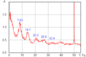 Для первых пяти гармоник эта формула даёт ряд частот 7,5 — 15,0 — 22,5 — 30,0 — 37,5 … Гц. Сравнивая теоретические частоты с частотами, полученными экспериментально (7,83 — 14,1 — 20,3 — 26,4 — 32,4 … Гц), заметим, что при хорошем совпадении частоты первой гармоники ошибка с ростом n увеличивается.