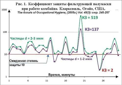 За последние несколько десятилетий в развитых странах проводились многочисленные испытания респираторов разных моделей непосредственно в производственных условиях (см. Испытания респираторов в производственных условиях)[50][51]. Для этого на поясе рабочего закрепляли 2 пробоотборных насоса и фильтры, и во время работы одновременно измеряли загрязнённость воздуха под маской респиратора и снаружи неё — вдыхаемого и окружающего воздуха. Концентрация вредных веществ под маской позволяет оценить их фактическое воздействие на рабочего, а деление средней наружной концентрации на подмасочную позволяет определить «коэффициент защиты» респиратора в производственных условиях.