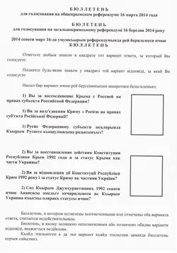 Бюллетени для проведения референдума 16 марта содержали варианты ответа на трёх языках: русском, украинском и крымскотатарском. Бюллетень, в котором были оставлены неотмеченными или были отмечены оба варианта ответа, считался недействительным[86]. Решение на референдуме принималось простым большинством голосов[b][c].