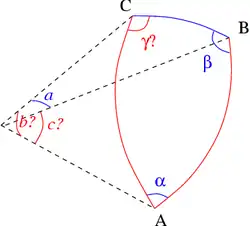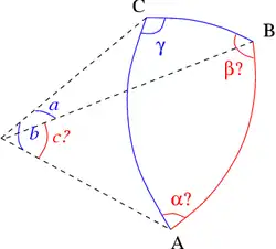 Решение треугольников в сферической геометрии имеет ряд отличий от плоского случая. Например, сумма трёх углов зависит от треугольника; кроме того, на сфере не существует неравных подобных треугольников, и поэтому задача построения треугольника по трём углам имеет единственное решение. Но основные соотношения: две сферические теоремы косинусов и сферическая теорема синусов, — используемые для решения задачи, аналогичны плоскому случаю.