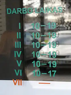 Римские цифры, обозначающие день недели, на витрине одного из магазинов в Вильнюсе