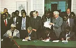 В 1979 году правительство Смита пошло на компромисс с умеренной оппозицией и подписало Внутреннее соглашение, согласно которому прошли всеобщие выборы, которые принесли победу епископу Абелю Музореве, а название страны менялось на Зимбабве-Родезия. Великобритания отказалась признать легальность нового режима. Новое Ланкастерхаузское соглашение с участием британских представителей, руководителей Родезии и лидеров радикальной оппозиции вернула страну временно под колониальную власть, которая провела новые выборы, закончившиеся победой лево-националистического Зимбабвийского африканского национального союза (англ. Zimbabwe African National Union; сокращённо ЗАНУ) и его лидера — Роберта Мугабе.