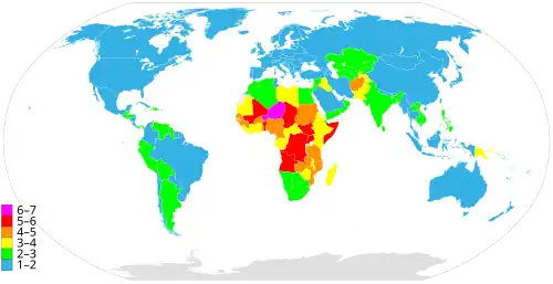 По наблюдениям 1995—2006 годов среди 171 стран и территорий СКР колебался от 0,85 в Макао в 2004 году до 7,3 в Конго в 1995 году[3]. По данным 2006 года среди 206 стран и территорий мира (данные по Монако отсутствуют) СКР колебался от 0,8 в Макао до 8,0 в Нигере, а медианное значение составляло 2,6[4].