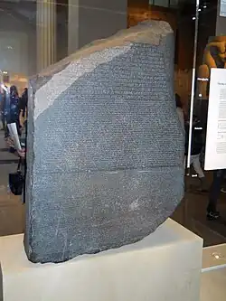 Розе́ттский ка́мень — стела из гранодиорита, найденная в 1799 году в Египте возле небольшого города Розетта (теперь Рашид), недалеко от Александрии, с выбитыми на ней тремя идентичными по смыслу текстами, в том числе двумя на египетском языке — начертанными египетскими иероглифами и египетским демотическим письмом, которое представляет собой сокращённую скоропись эпохи позднего Египта, и одним на древнегреческом языке. Древнегреческий был хорошо известен лингвистам, и сопоставление трёх текстов послужило отправной точкой для расшифровки египетских иероглифов. С 1802 года Розеттский камень хранится в Британском музее (инвентарный номер EA 24).