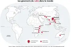 После Второй мировой войны месторождения рубина были обнаружены на Мадагаскаре, Непале, Пакистане, Таджикистане, Танзании и Вьетнаме (с 1970 — 80-х[9] годах).
