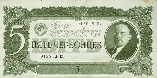 Первыми денежными знаками СССР стали банкноты номиналом в 10, 15 и 25 тысяч рублей, выпущенные согласно постановлениям ЦИК и СНК СССР от 23 ноября[4] и 18 декабря 1923[5] и от 7 февраля 1924 года[6] соответственно. Первым постановлением также предполагался выпуск денежных знаков номиналом 100, 250, 500, 1000 и 5000 рублей, однако он так и не был осуществлён.