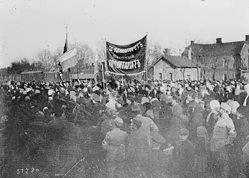 Демонстрация большевиков перед поездом с французской миссией в Румынии, предположительно между октябрём и декабрём 1917 года.