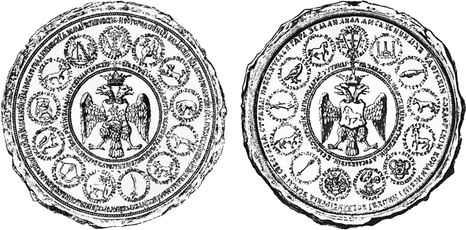Основы русской геральдики утвердились во времена царя Алексея Михайловича, когда на московскую службу перешли многие выходцы из Великого княжества Литовского. Если до него и существовали некоторые эмблемы[6], как, например, двуглавый орёл государственной печати, печати некоторых городов, тамги князей и т. п., то они не имели полноты и законченности и, соответственно, ещё не приняли постоянных геральдических форм.