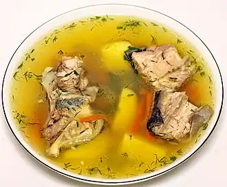 Первые жидкие блюда сохраняли неизменное значение на протяжении всей истории развития русской гастрономической культуры. На древнерусском этапе горячие жидкие блюда назывались хлёбовами[27][28], их готовили в горшках в печи. Самые распространённые хлёбова — щи и овощные похлёбки, а также различные мучные затирухи, заварихи, болтушки, саламаты[27]. Жидкие блюда на бульоне, которые в отличие от щей и похлёбок не содержали овощей, именовались словом «уха», восходящим к индоевропейскому корню со значением «похлёбка, жижа» и имеющим когнаты в санскрите (уū́ṣ) и латыни (iūs}[29]. Ушные блюда вплоть до XVII века варили не только из рыбы, но и мяса, птицы и дичи и клали в них пряностей в несоизмеримо большем количестве, чем теперь. Уха стала в конечном итоге исключительно рыбным блюдом потому, что, по мнению В. В. Похлёбкина, в таком исполнении она менее всего походила на другие русские жидкие блюда[30]. В зависимости от набора пряностей ухи подразделялись на белые, чёрные и жёлтые. Помимо «рядовой» готовили уху с толченцами (клёцками), с тельным, щипаную (с крошеной вяленой рыбой) и раковую[31]. По впечатлению, сложившемуся у Александра Дюма во время путешествия по России, русские сходили с ума по стерляжьей ухе[32].