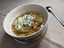 Согласно словарю В. И. Даля, похлёбкой называется «всякая жидкая пища, которую хлебают, едят ложкою»[48]. С подачи В. В. Похлёбкина, в современной русской кулинарии похлёбками признают только лёгкие прозрачные жидкие кушанья на овощном отваре с овощами, крупами и бобовыми, без жиров и масел, а ресторанные названия «похлёбка мясная» или «похлёбка куриная» он считал недопустимыми[49]. В истории русской кухни сохранились картофельная, луковая, чечевичная и брюквенная похлёбки, каждой из которых полагался определённый набор овощей и пряностей (главным образом, петрушка, укроп, сельдерей и чеснок), обеспечивавших особый аромат[50][51]. Грибная похлёбка называлась грибницей, репяная — репницей[52]. Жидкие, пустые похлёбки — болтушки (или болтунки) взбалтывали на муке или толокне[53], по этой семантической модели того, кто ведёт пустые разговоры, называют болтуном[54]. Саламаты представляли собой пресные вскипячённые болтушки консистенции киселя или кашицы, которые ели с солью и маслом[55] или салом[56]. Затирухи[57] и заварихи[58] заправляли чесноком и прожаренной на масле или сале мукой[28]. Кулеш, южнорусскую мучную или пшённую похлёбку с салом или растительным маслом[28][59], В. В. Похлёбкин относил к кашам[60]. Исконно русские похлёбки ушли в прошлое, да и само слово имеет разговорное значение «очень невкусного, чересчур жидкого варева»[61], а по русским пищевым канонам первое должно быть наваристым, густым и жирным[54]. Знаменитая кулинарка Е. А. Авдеева в издании «Полной поваренной книги русской опытной хозяйки» 1875 года называет огуречной похлёбкой рассольник, приводит рецепт говяжьей похлёбки «а-ля минут», а также трёх похлёбок из субпродуктов в разделе «Стол для прислуги»[62]. У Е. И. Молоховец о похлёбках речи вообще нет[63], в современной русской кухне их часто маскируют под названиями «суп крестьянский»[50] или «суп вегетарианский»[64].