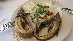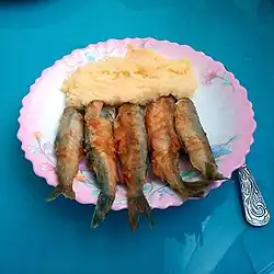 В Древней Руси с её обширными бассейнами крупных рек разнообразная пресноводная рыба всегда занимала значительное место в питании населения[84]. Роль рыбных блюд в русской кухне ещё более возросла после крещения Руси и введения постов. Рыбу разрешалось есть в период многих постов, блюда из неё считались полупостными[85], поэтому рыбные блюда появлялись на русском столе чаще мясных[86]. Рыбаки в Древней Руси именовались ловцами, а торговцы рыбой — рыбаками. Рыбная ловля, имевшая в хозяйстве Московского государства важное значение, регламентировалась целой системой правовых норм. Рыбными промыслами часто владели монастыри, на них использовался артельный метод. Простой народ ел рыбу из местных водоёмов, для феодальной и духовной знати привозную рыбу доставляли с Белого, Каспийского и частично Азовского морей[87]. В «Домострое» упоминается 25 видов рыб для приготовления кушаний, русский рыбный стол производил большое впечатление на иностранцев, которые удивлялись и размерам рыб, и количеству подаваемых рыбных блюд[88]. Морская рыба вошла в обиход в России после освоения берега Северного моря и получила распространение в XVIII веке. Пётр I уделял большое внимание добыче морской рыбы и в 1721 году издал указ о передаче морских промыслов купечеству в вольное производство «для желаемой пользы и умножения торговли у города Архангельского и в Кольском порте от рыбных промыслов сала китового, моржового, трески рыбы и иных морских зверей». К треске, зубатке, палтусу и другой морской рыбе русские привыкали долго[89], и вплоть до конца XIX за северными поморами сохранялось презрительное прозвище «трескоеды». В русскую ресторанную кухню блюда из морской рыбы проникали под французскими названиями: «лабардан огратен» (треска запечённая) и «тюрбо миньер» (камбала с лимоном)[90].