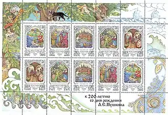 - ↑ № 370-374. К 200-летию со дня рождения А. С. Пушкина. Иллюстрации к сказкам. rusmarka.ru. АО «Марка». Дата обращения: 19 августа 2018. Архивировано 22 апреля 2018 года.