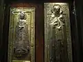 Святославов крест в экспозиции Георгиевского собора-музея- Аврам (новгородский мастер). «Магдебургские врата» Новгородского собора святой Софии (фрагмент), 1152—1154 гг. с автопортретом Авраама (ок. 1450).