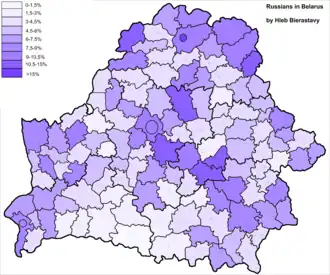 Русские (бел. Рускія ў Беларусі) являются второй по численности национальной группой на территории современной Республики Беларусь с середины XX века. По переписи 2019 года в стране проживало 706 992 русских, которые составляли 7,5 % населения республики. При этом с титульной национальностью — белорусами — их объединяет длительная и довольно сложная система этно-языковых общностей. Для современной республики характерен самый высокий в странах СНГ уровень несоответствия между русской и русскоязычной идентичностью[1]. Так, русскими себя считают только 8 % населения, но русский язык родным называют 40 %, а основным — 70 % населения. Достигнув пика в 1989 году (1,34 млн или 13,2 %), доля и численность этнических русских в стране с тех пор неуклонно сокращается, а русскоязычных — растёт. Особенностью русского населения Беларуси является его довольно дисперсное расселение по территории страны с максимальной концентрацией в крупных областных центрах. Примечательно и то, что, в отличие от Украины, Казахстана, стран Прибалтики, в Беларуси нет ни одного города или региона, где бы русские составляли абсолютное или хотя бы относительное большинство населения. Максимальная концентрация русских в Беларуси наблюдается в городах Новополоцк и Полоцк (15 и 14 % соответственно).