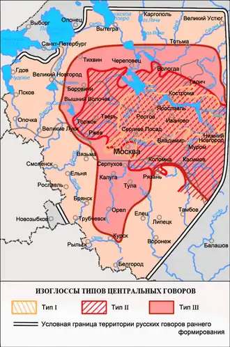 Рассматривается три варианта говоров центра, занимающих разные по величине территории (I тип внутри II типа, и оба этих типа внутри самого крупного III типа). Такое размещение говоров центральной части обусловлено сложностью определения границ территории, так как члены соответственных явлений, совпадающие с литературным языком, также известны и на территории периферийных говоров, при этом ареалы этих языковых явлений выделяют говоры центра в самых различных пределах. Такая неоднозначность и сложность определения границ связана с условностью разделения русских говоров на центральные и периферийные[4]. В связи с этим область центральных говоров определяется как расширяющаяся территория от I типа к III типу, на которой отсутствуют диалектные члены соответственных явлений периферийных говоров. Различие размеров территорий разных типов говоров центра соответствует различию размеров ареалов говоров периферии, I типу центральных говоров соответствует наиболее широкое размещение диалектных членов периферийных говоров, а II и III типам соответствуют менее широкое или совсем ограниченное их распространение[8][9].