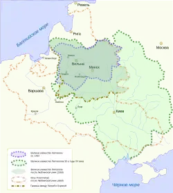 Ключевым моментом в истории Великого княжества Литовского стало заключение в 1385 году личной унии с Королевством Польским. Великий князь литовский Ягайло, женившись на наследнице польского престола Ядвиге, был коронован как король польский. Одним из обязательств, взятых на себя Ягайло, была христианизация языческих земель на северо-западе княжества в течение четырёх лет. С этого времени влияние католицизма, пользующегося сильной государственной поддержкой, в Литовском княжестве росло. Через несколько лет после заключения унии в результате династической борьбы Ягайло фактически утратил контроль над Великим княжеством Литовским, но при этом формально оставался главой государства. Великим князем Литовским стал его двоюродный брат Витовт, почти сорокалетнее правление которого считается расцветом Великого княжества Литовского. После заключения Островского соглашения и окончания войны за галицко-волынское наследство (1392) были лишены уделов князья Свидригайло в Витебске, Дмитрий-Корибут в Новгород-Северском, Федор Кориатович на Подолье, Владимир Ольгердович в Киеве, также Витовт заменил смоленского князя на своего наместника (1396). Данная политика была направлена прежде всего на усиление великокняжеской власти на наиболее экономически развитых, южных и восточных землях великого княжество Литовского. Вскоре она была свёрнута, и князья стали вновь получать владения в качестве уделов[28]. Витовту почти удалось избавиться от польского влияния, но его планы были сорваны разгромным поражением от татар в битве на Ворскле. В его правление были окончательно подчинены Смоленск и Брянск, на некоторое время под контролем Великого княжества Литовского оказались Тверь, Рязань, Пронск, Великий Новгород и ряд других русских городов. Современники отмечали, что Витовт, ещё при жизни прозванный Великим, был куда более влиятельной особой, чем сам Ягайло.