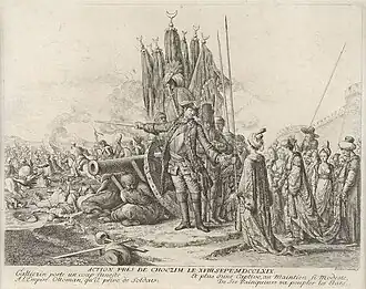 6, 14 и 23 августа турки предпринимали попытки переправиться у Хотина через Днестр. Самая сильная атака состоялась 29 августа. Главные силы нового визиря (до 80 тыс.[26]) атаковали отряды Я. А. Брюса и И. П. Салтыкова, но были в ходе 12-часового сражения отброшены за реку. Турки только на поле боя оставили около 3000 убитых, а часть увезли при отступлении, потери русских — 182 убитых и 337 раненых[27]. 6 сентября турецкий отряд численностью 9 тыс.[28] или 12 тыс. (5 тыс. пехоты и 7 тыс. кавалерии)[29] занял для защиты своих фуражиров предмостное укрепление на левом берегу Днестра напротив Хотина. Из-за разлива Днестра он не мог быстро переправиться обратно и был отрезан от своих главных сил. Голицын направил 8 гренадерских батальонов и 12 гренадерских рот под командой полковников Отто фон Вейсмана, О. А. Игельстрома, Е. П. Кашкина и А. Н. Сухотина атаковать турок вечером в 9 часов. В резерве были 3 пехотных полка под началом полковника М. Н. Кречетникова. В темноте в штыковой атаке турецкий отряд был уничтожен, значительная часть турок была заколота штыками, часть разбежалась или утонула при попытке спастись вплавь, до 400 человек взято в плен. Уничтожение остатков этого отряда продолжалось до 8 сентября. Русские гренадеры потеряли 94 убитых и 511 раненых. Между тем артиллеристы Голицына закончили возведение по проекту генерал-майора барона Иосифа де Молино батареи из 24 осадных орудий напротив Хотина и 8 сентября меткий огонь этой батареи под командой майора Людвига вынудил турок спешно отступить из своего хотинского лагеря.