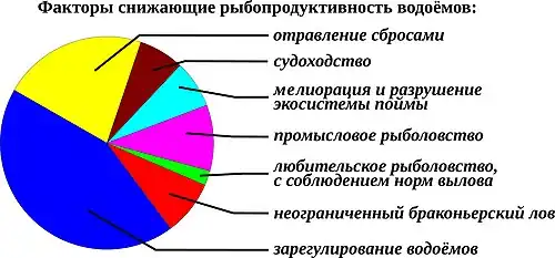 - Строительство плотин затрудняет или делает невозможным преднерестовые миграции рыб[12][13]. Зарегулирование водоёмов способствует уменьшению половодья, необходимого для нереста на заливной пойме, который в 50 раз эффективнее нереста в русле[14]. Весенние сбросы воды в нерестовый период приводят к гибели икры и мальков[15]. Падение уровня водоёмов и водосброса речных систем[16][17], что приводит к сокращению кормовой базы, исчезновению мелководий с водной растительностью, служивших естественными фильтрами и нерестилищами. Частично компенсировать данный негативный фактор призваны искусственные зарыбления, масштаб которых в течение последних десятилетий крайне недостаточен[18][19].