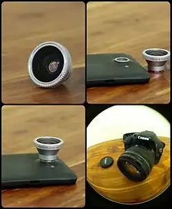 Дисторсирующие насадки оказались удобны для совместной работы с телевизионными вариообъективами, придавая характерное искажение и увеличивая угол обзора, однако из-за оптических особенностей оптики с переменным фокусным расстоянием вся комбинация работоспособна только в положении «макро» при неработающем зуме[52]. Кроме того, такие насадки рассчитаны на очень близкое расположение к основному объективу, накладывая определённые ограничения на диаметр и конструкцию его оправы. В последнее время получили широкое распространение дисторсирующие насадки для камерафонов, к которым крепятся магнитным кольцом или специальным зажимом[53]. Поле зрения камер с такими насадками не всегда достигает 180°, но характерная дисторсия обеспечивает необходимый изобразительный эффект без обработки снимков соответствующими приложениями[54].
