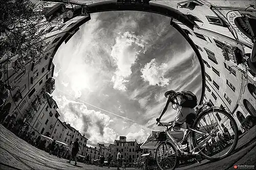 • Циркулярный (или «круговой») — в данном случае круг поля изображения, даваемого объективом, не заполняет кадровое окно целиком, а его диаметр близок к размеру короткой стороны кадра[40]. Такой объектив имеет угол поля зрения 180° и более во всех направлениях. Зачастую габариты циркулярных объективов из-за большого диаметра передних линз превышают размеры камеры в несколько раз. Наиболее широкое применение они нашли в специальных областях прикладной фотографии, например в метеорологии и астрономии для съёмки небосвода.
