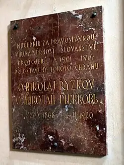 Оригинальный текст (чешск.)MUČEDNÍK ZA PRAVOSLAVNOU / VÍRU A VĚRNOST SLOVANSTVU / PROTOJEREJ A 1901–1914 / PŘEDSTAVENÝ TOHOTO CHRÁMU / O. NIKOLAJ RYŽKOV / 26. IX. 1868 – 6. II. 1920.