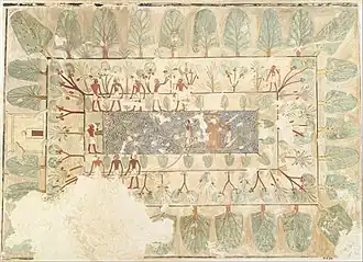 Начиная со времён Нового Царства общей чертой роскошных поместий богатых египтян стали сады удовольствия. Согласно рисункам на гробницах, планировка этих садов была более или менее стандартной. В центре располагался прямоугольный пруд с последовательными рядами деревьев вокруг него. Края водоёмов были наклонными с лестницами, позволявшими садоводам собирать воду для орошения[5]. Пруд часто окружался стенами или колоннами, увитыми виноградными лозами и украшенными красочными картинами людей, животных и растений.