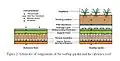 Зеленые крыши могут быть экстенсивными или интенсивными.[13] Эти термины используются для описания типа требуемой посадки. Панели, из которых состоит зеленая крыша, обычно имеют толщину не более нескольких сантиметров до 30 см (от нескольких дюймов до фута), поскольку вес является важным фактором при покрытии всей поверхности крыши. Растения, которые входят в зеленую крышу, обычно представляют собой очиток или другие растения с неглубокими корнями, которые выдерживают жаркие, сухие и ветреные условия, преобладающие в большинстве садов на крышах. С зеленой крышей «слой растений может защищать до 87 % солнечного излучения, в то время как голая крыша подвергается прямому воздействию на 100 %».[14]