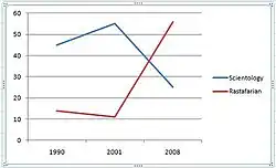 Трендовый график ARIS (1990—2008), где выявлено снижение популярности саентологии в США до 25 тыс. последователей (2008 год), где для сравнение приводится растафаринство