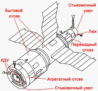 К агрегатному отсеку был пристыкован модуль «Квант», к стыковочному узлу модуля «Квант» причаливали корабли «Союз» или «Прогресс».