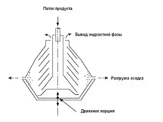 Рабочее колесо в герметичном сепараторе, где продукт подаётся снизу через впускной коленчатый патрубок (бактофуга), вращается вместе с барабаном и таким образом имеет сопловую функцию. В более распространённом сепараторе с питанием сверху, рабочее колесо прикреплено к крышке барабана и работает как центробежный насос. Осадок движется вдоль нижней стороны тарелок (вместе с тяжёлой жидкостью) к периферийной части сепаратора под действием центробежной силы, где он собирается в ёмкости для осадка. Когда давление с нижней стороны поршня падает, поршень опускается вниз, открывая отверстия для разгрузки осадка. Разгрузившийся материал транспортируется в приёмник осадка.