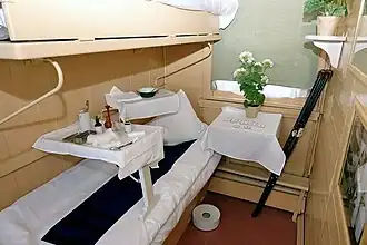 Вагон-лазарет в среднем вмещал около 30 тяжелораненых, которых либо готовили к операции, либо им требовался специальный уход. Носилки-лежаки ставили на аппарели, с которых удобно было взять больного и перенести в операционную, в другой вагон или в морг[17].