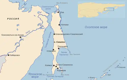 Сахали́н — остров у восточного побережья Азии. Вместе с Курильскими островами целиком входит в состав Сахалинской области. Крупнейший остров России. Омывается Охотским и Японским морями. От материковой Азии отделён Татарским проливом (в самой узкой части — проливе Невельского — имеет ширину 7,3 км и замерзает зимой); от японского острова Хоккайдо — проливом Лаперуза.