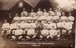 В 1907 году была создана Регбийная лига Нового Южного Уэльса, объединение спортивный клубов штата, игравших в регби-13 (регбилиг). Тогда же один из сильнейших регбистов страны Дэлли Мессенджер завершил выступления в регби-15 и перешёл в конкурирующую лигу[17]. В следующем году была собрана команда, отправившаяся на выступления в Британии. Сборная получила название «Рэббитс» (англ. Rabbits, «кролики») и с ним покинула Сидней[18]. Игроки, однако, посчитали это прозвище унизительным, и вскоре команда изменила название на «Уоллабис» (англ. Wallabies, «валлаби»)[19]. Матчи в Великобритании совпали с проведением лондонских Олимпийских игр, в программу которых входило и регби. Соревновательная программа регбийного турнира включала лишь один матч, в котором сыграли Австралия[прим. 3] и сборная графства Корнуолл, которая на правах чемпиона представляла Великобританию. В итоге австралийцы выиграли со счётом 32:3, а самым результативным игроком «Уоллабис» стал Филлип Кармайкл[20]. По возвращении на родину более половины игроков сборной перешли в команды по регби-13, которые, в отличие от клубов по регби-15, предлагали своим спортсменам заработок[21].
