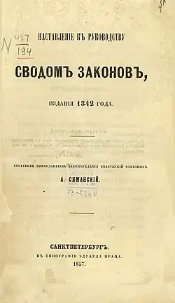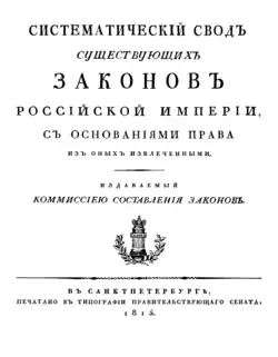 - ↑ Свод законов Российской империи // Советская историческая энциклопедия : в 16 т. / под ред. Е. М. Жукова. — М. : Советская энциклопедия, 1969. — Т. 12 : Репарации — Славяне. — Стб. 609.