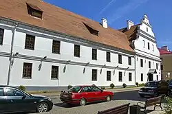 Монастырский корпус соединён с церковью Святого Духа крытой галереей, идущей вдоль зубчатой стены в виде аркады, разделённой лопастями на проёмы. В месте примыкания стены к монастырского здания располагаются трёхпролётные ворота с широким центральным проходом и двумя узкими боковыми арками. Галерея была прорезана маленькими окнами, которые во время обороны можно было использовать как бойницы.