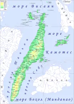 Остров Себу имеет вытянутую в длину на 225 км с севера на юг форму. Из мелких окружающих его островов наиболее известны Мактан, Бантайян, Малапаскуа и группа островов Камотес. Остров имеет узкую низменную береговую линию. В рельефе здесь преобладают невысокие горы, около 1000 м, горные гряды протянуты в меридиональном направлении.