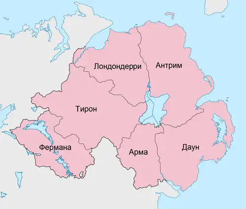 Антрим (Antrim, Aontroim), Арма (Armagh, Ard Mhacha), Даун (Down, An Dún), Лондондерри (Londonderry, Doire Cholm Cille) или Дерри (Derry, Doire), Тирон (Tyrone, Tír Eoghain), Фермана (Fermanagh, Fear Manach).
