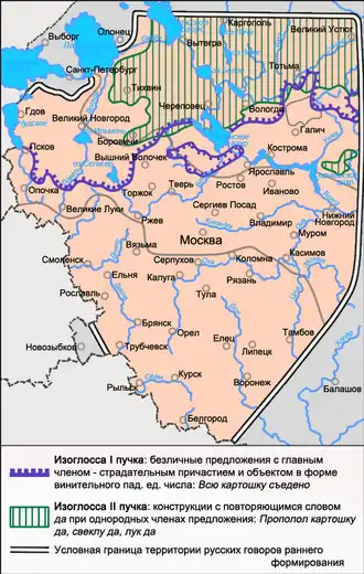 Языковые явления северной зоны группируются в два различных по охвату ареала, выделенные двумя пучками изоглосс. Близко расположенные друг к другу пучки изоглосс в их протяжении с востока к центральной части, начинают значительно расходиться в своих западных отрезках. Сходством языковых комплексов двух пучков изоглосс является то, что они включают в себя все говоры северного наречия кроме Костромской группы, а их отличием является то, что языковой комплекс I пучка изоглосс северной диалектной зоны охватывает большую часть территории западных среднерусских говоров, продвигаясь значительно на запад и юго-запад, а изоглоссы II пучка характеризуют только группы говоров северного наречия. Таким образом, особенностью западных среднерусских говоров является отсутствие в них диалектных явлений II пучка изоглосс, а особенностью говоров Костромской группы является отсутствие в ней всех диалектных явлений северной зоны (в отличие от других говоров северного наречия). Совмещение изоглосс I и II пучка разграничивает ареалы Вологодской и Костромской групп говоров, усиливая их обособление друг от друга в пределах восточной части говоров северного наречия. Изоглоссы северной зоны, пересекаясь с изоглоссами северо-западной и юго-западной диалектных зон, занимают территорию распространения западных среднерусских говоров. Северная диалектная зона включает в себя все периферийные говоры северного наречия и почти не охватывает говоры, которые с севера примыкают к говорам центрального типа[1].