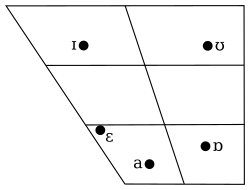 | /aɪ/ | fight, ride, try | [äɪ] о файле в джорджи и нортамберлендском диалекте, если не на конце слова или до звонкого фрикативного согласного: [ɛɪ~əɪ] о файле | |||||||