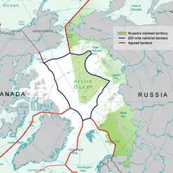 После ратификации Конвенции ООН по морскому праву страны имеют десятилетний период на предъявление требований по расширению своей 370-километровой зоны[72]. Страны, ратифицировавшие конвенцию (Норвегия в 1996 году[73], Россия в 1997 году[73], Канада в 2003 году[73] и Дания в 2004 году[73]), уже запустили проекты для обоснования своих претензий о принадлежности некоторых секторов Арктики к их территории[74][75].